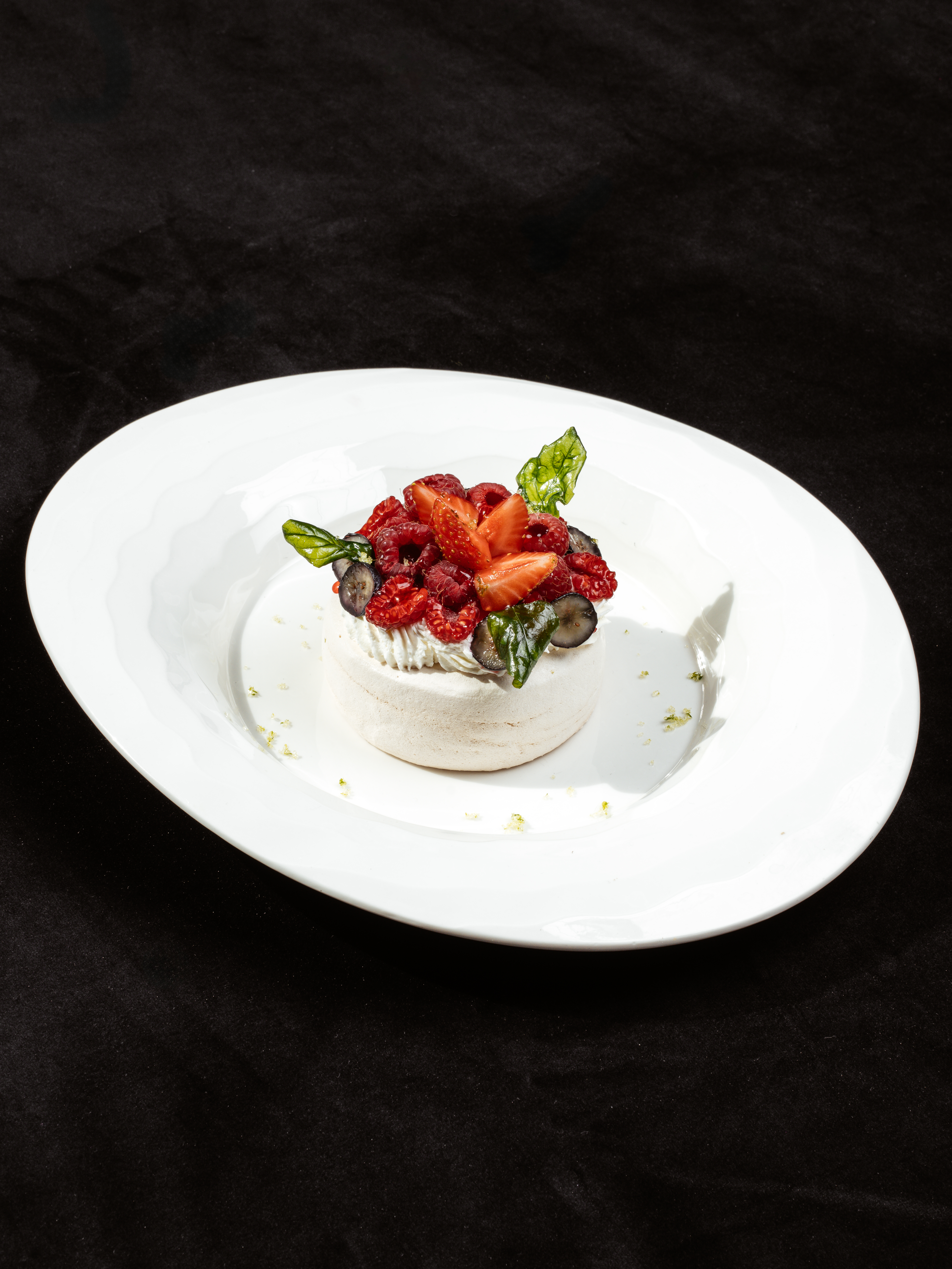 blackberry, raspberry, strawberry, cream, lemon, powdered sugar