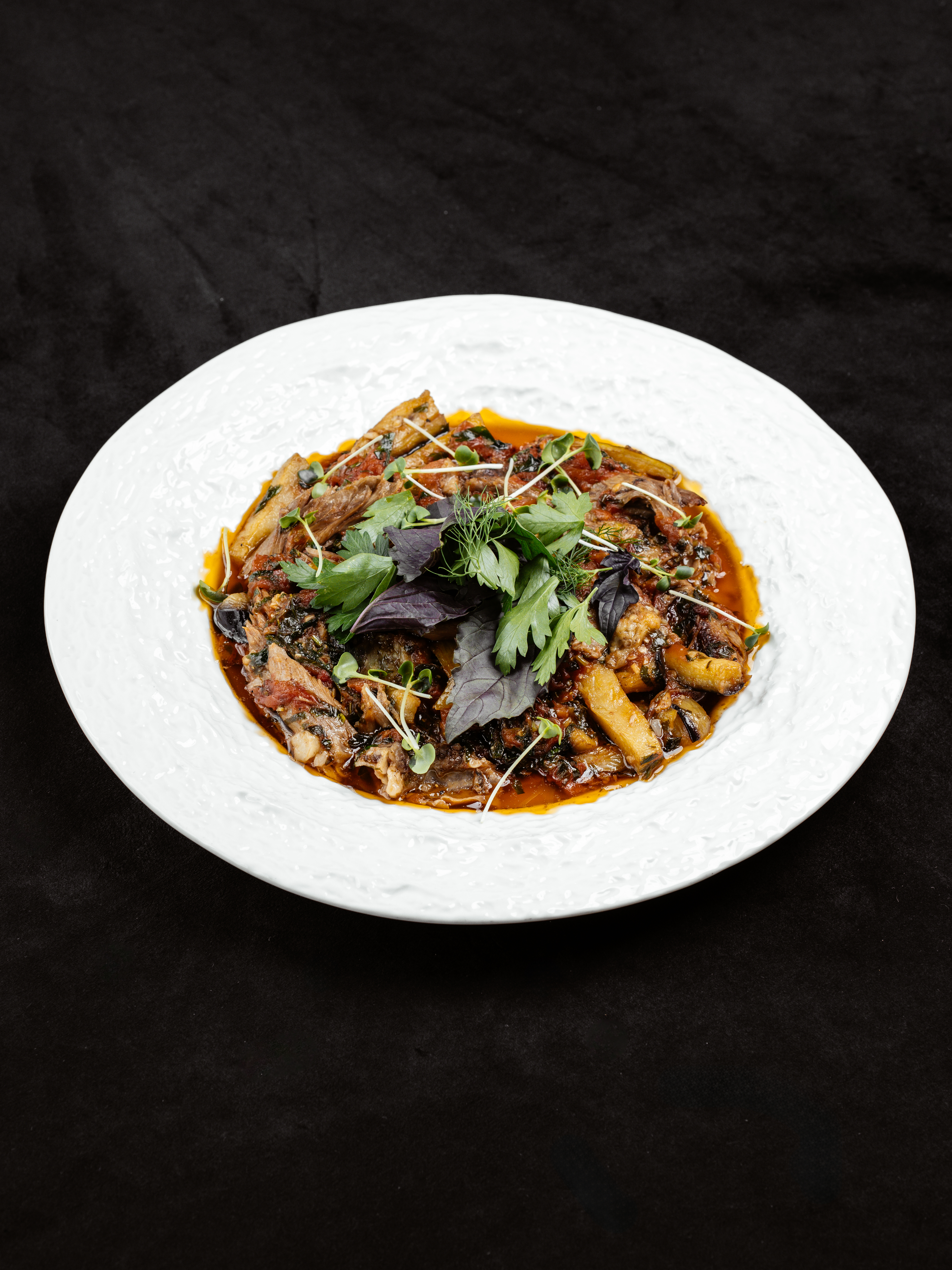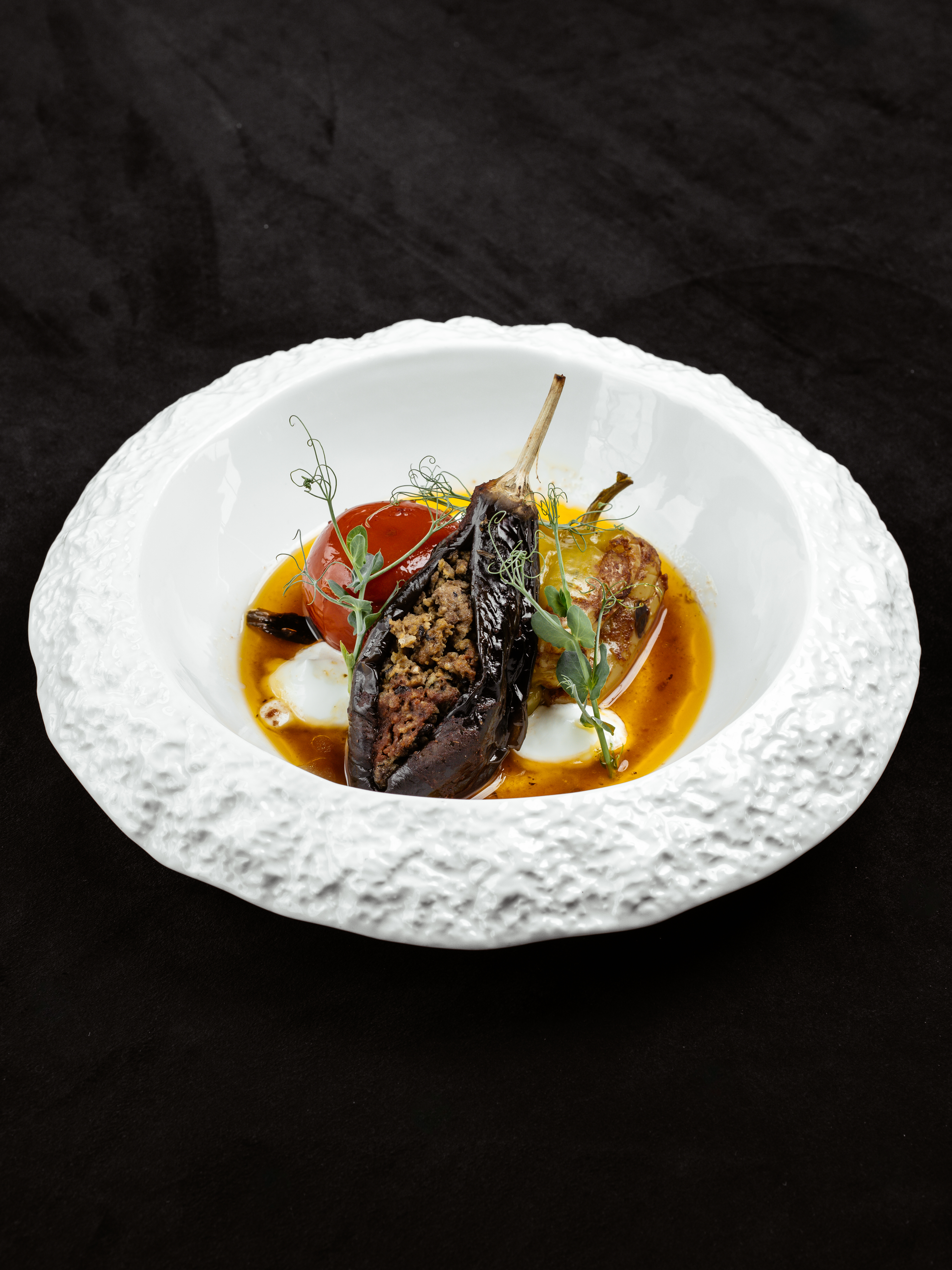 eggplant, pomegranate, yogurt, garlic, greens, spices
